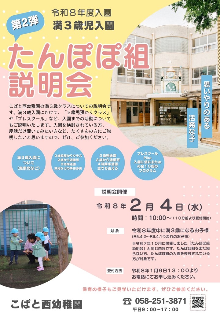 令和8年度の満3歳入園「たんぽぽ組説明会」を開催します。