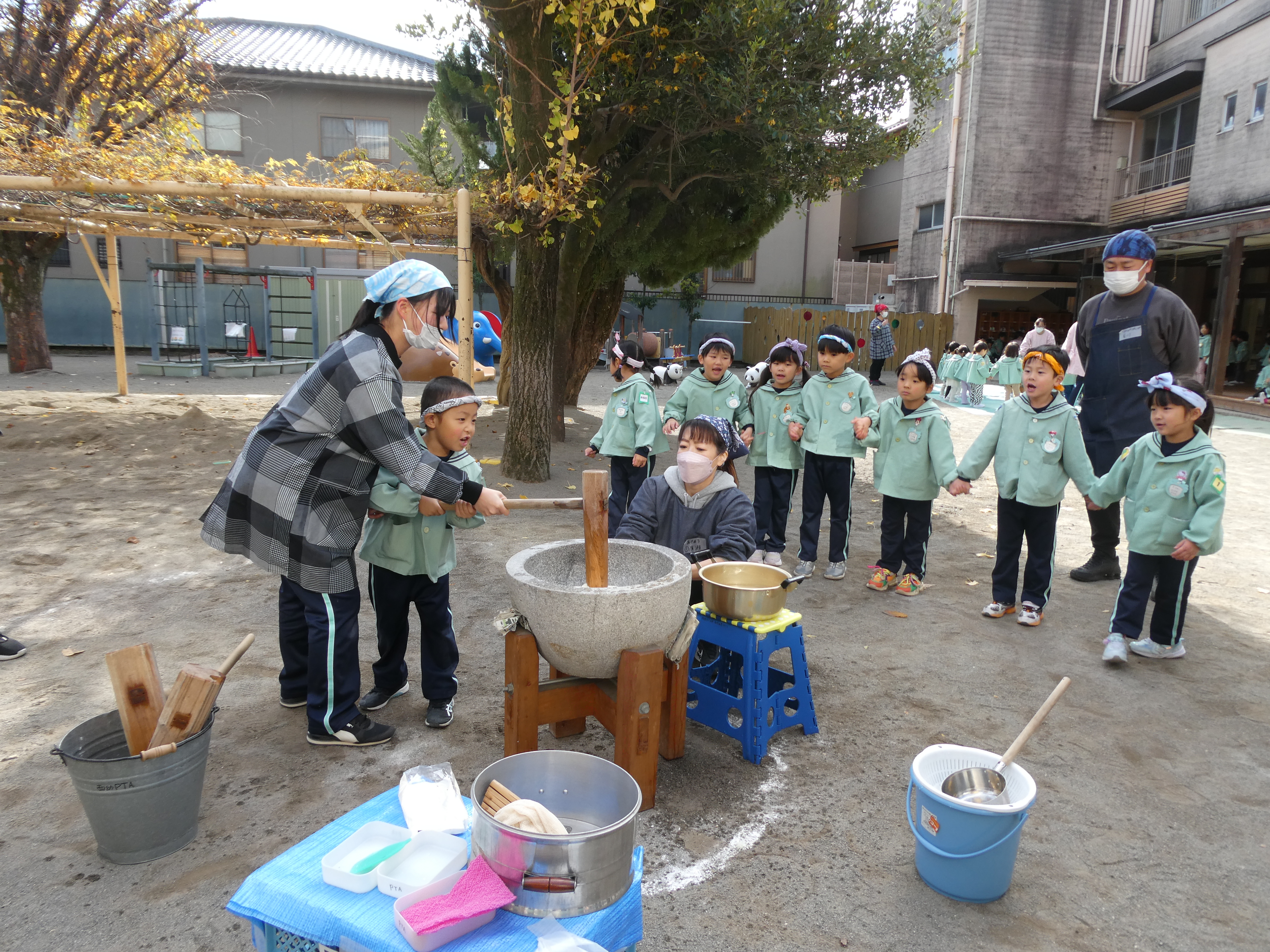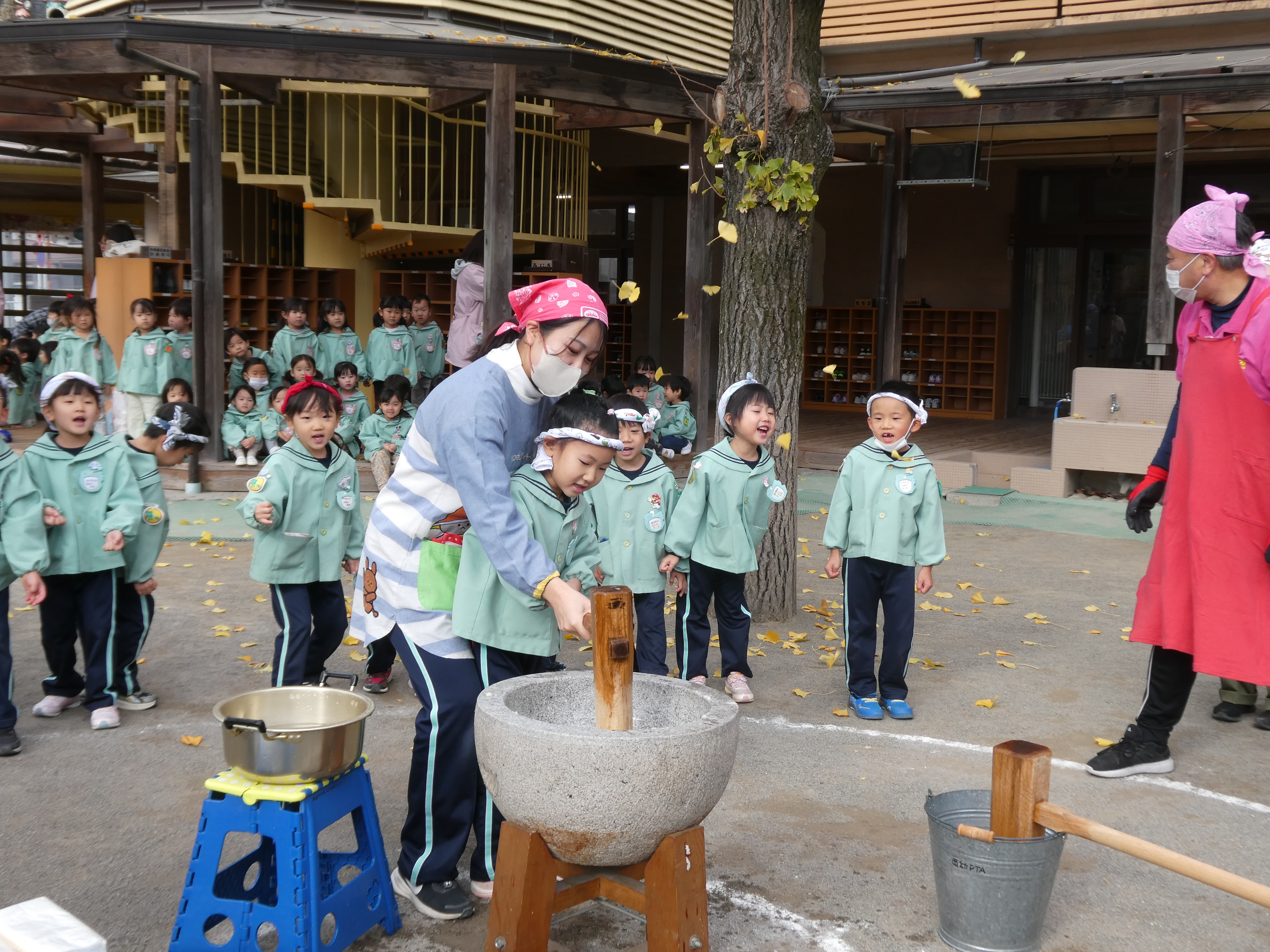 はちまきをキュッと巻いて気合を入れ、みんなが楽しみにしていた‟おもちつき”の日を迎えました。園庭にはもち米のいい香りがふわっと広がり、「いい匂いー!」と子どもたちのわくわくした声が響きます。