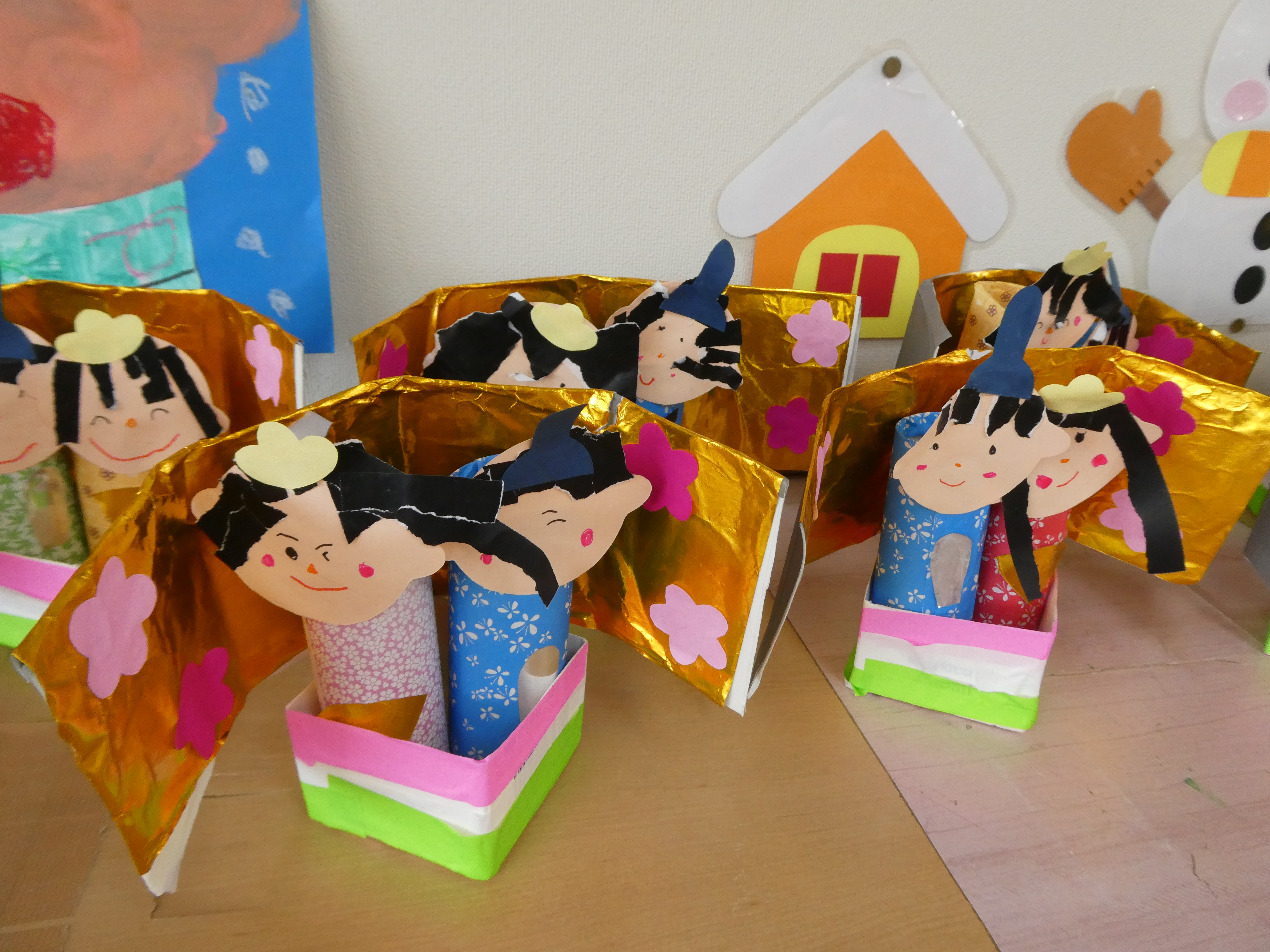 製作を進めながら「これ3色団子の色だ!」「お内裏様とお雛様の持ってるものが違うね」と、