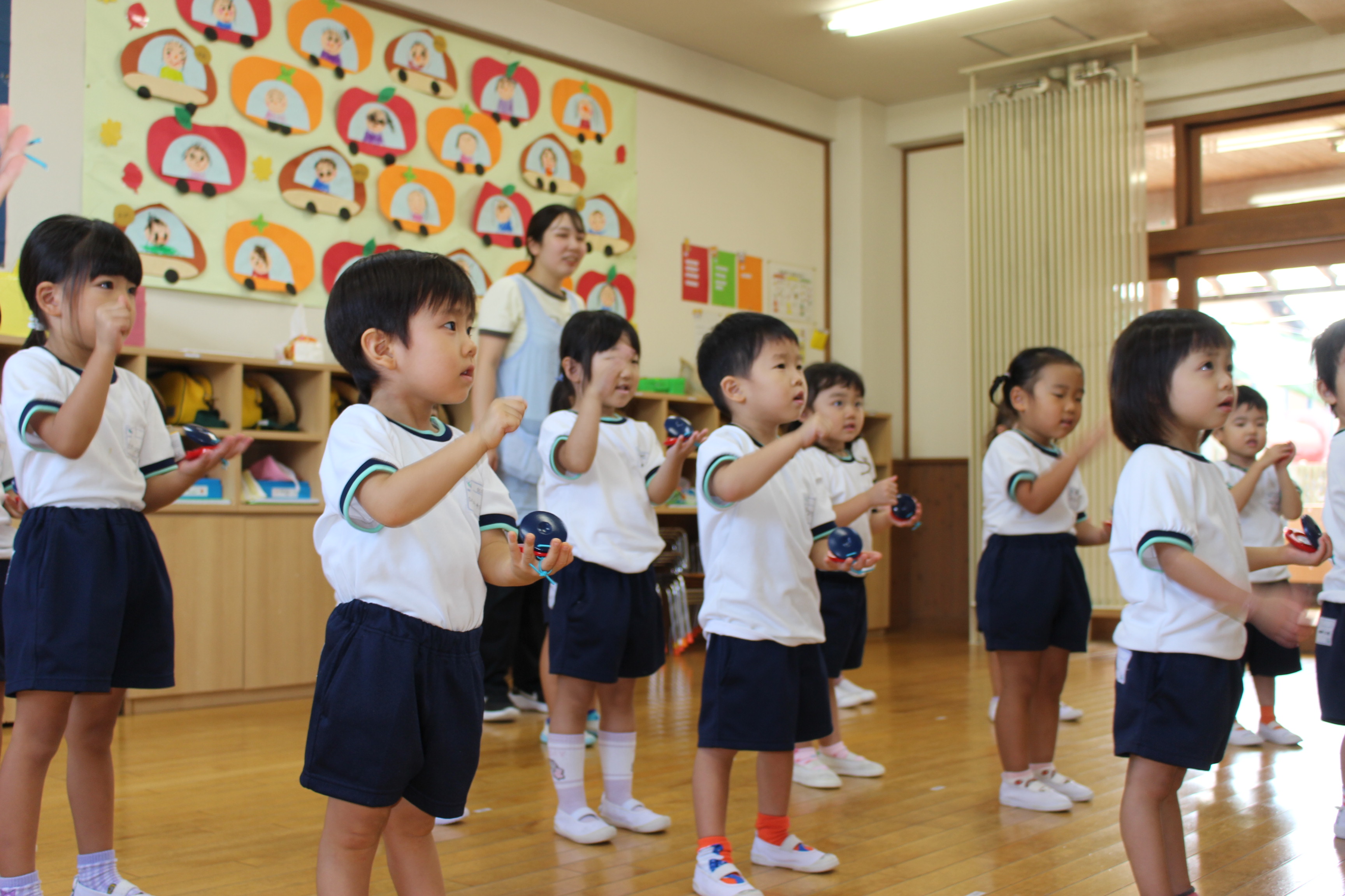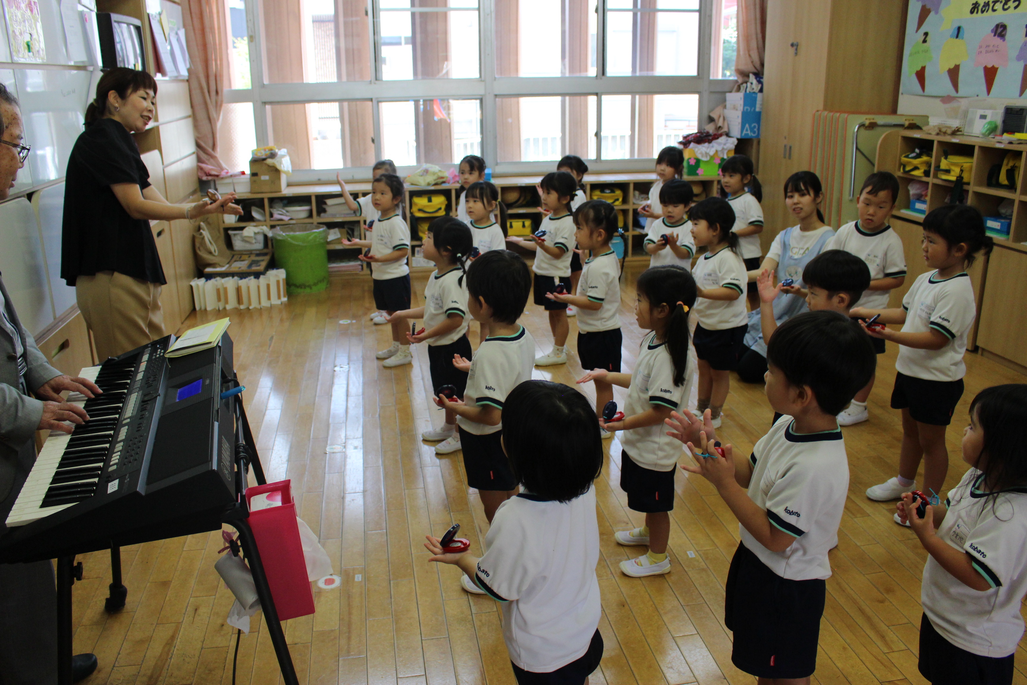 初めてのぽっぽのドレミタイムでは、音楽指導の安田先生と礼子先生と一緒に歌を歌ったり、カスタネットを鳴らしたりして遊びました。